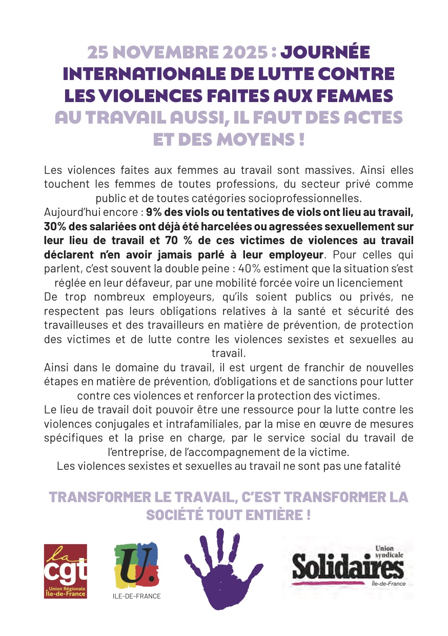 25 novembre 2025 - Journée internationale de lutte contre les violences faites aux femmes au travail aussi, il faut des actes et des moyens !
