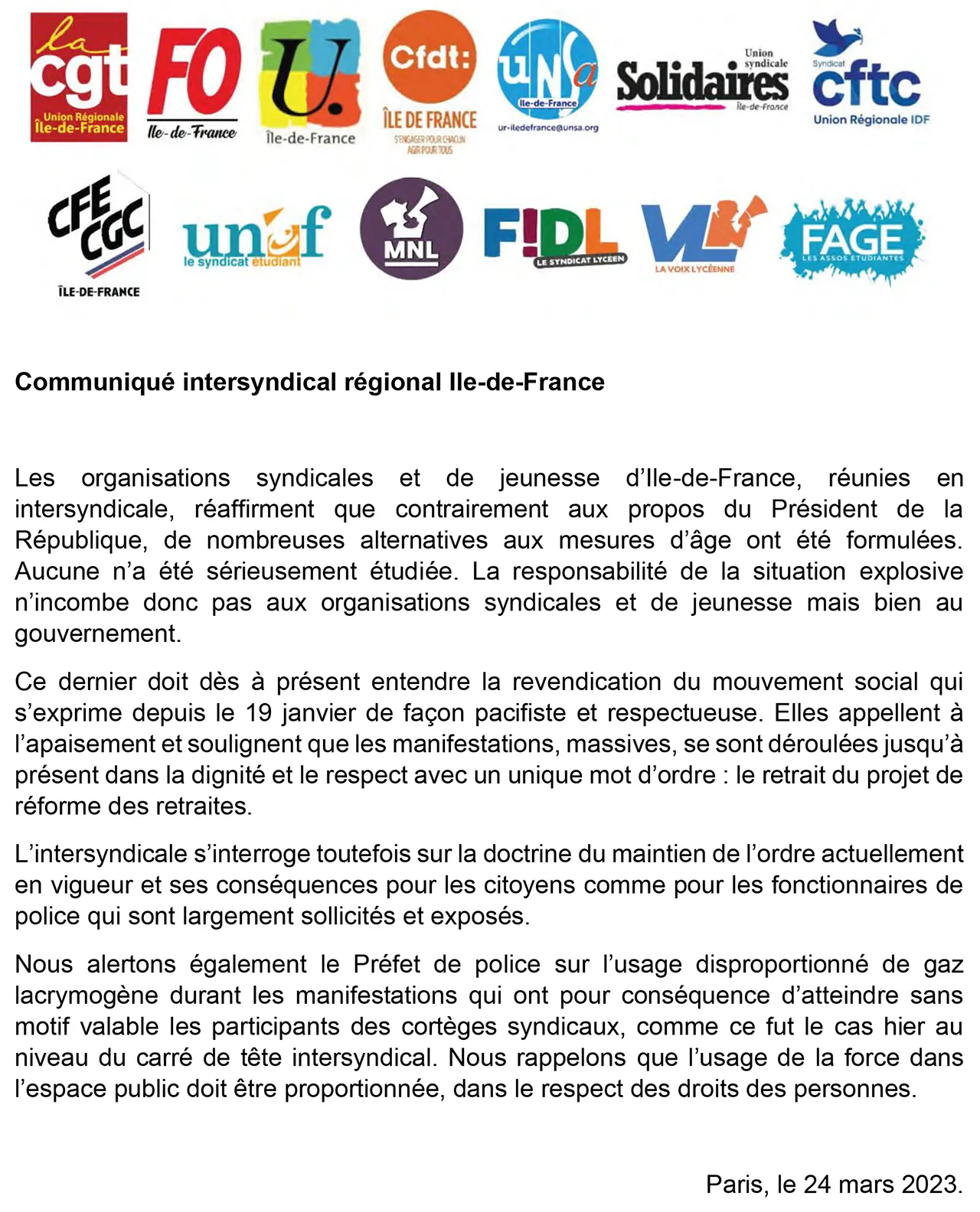 Les organisations syndicales et de jeunesse d’Ile-de-France réaffirment que contrairement aux propos du Président de la République, de nombreuses alternatives aux mesures d’âge ont été formulées.